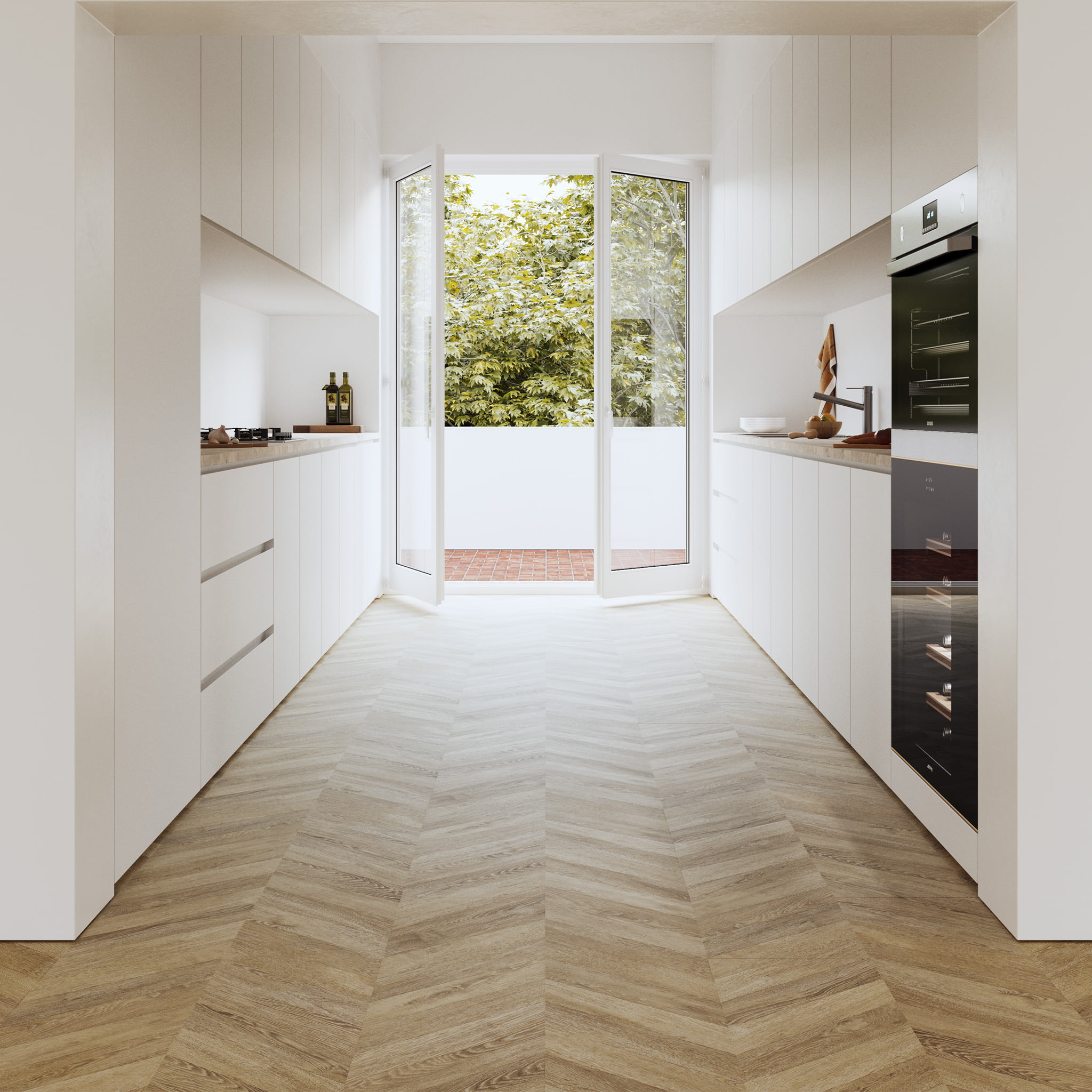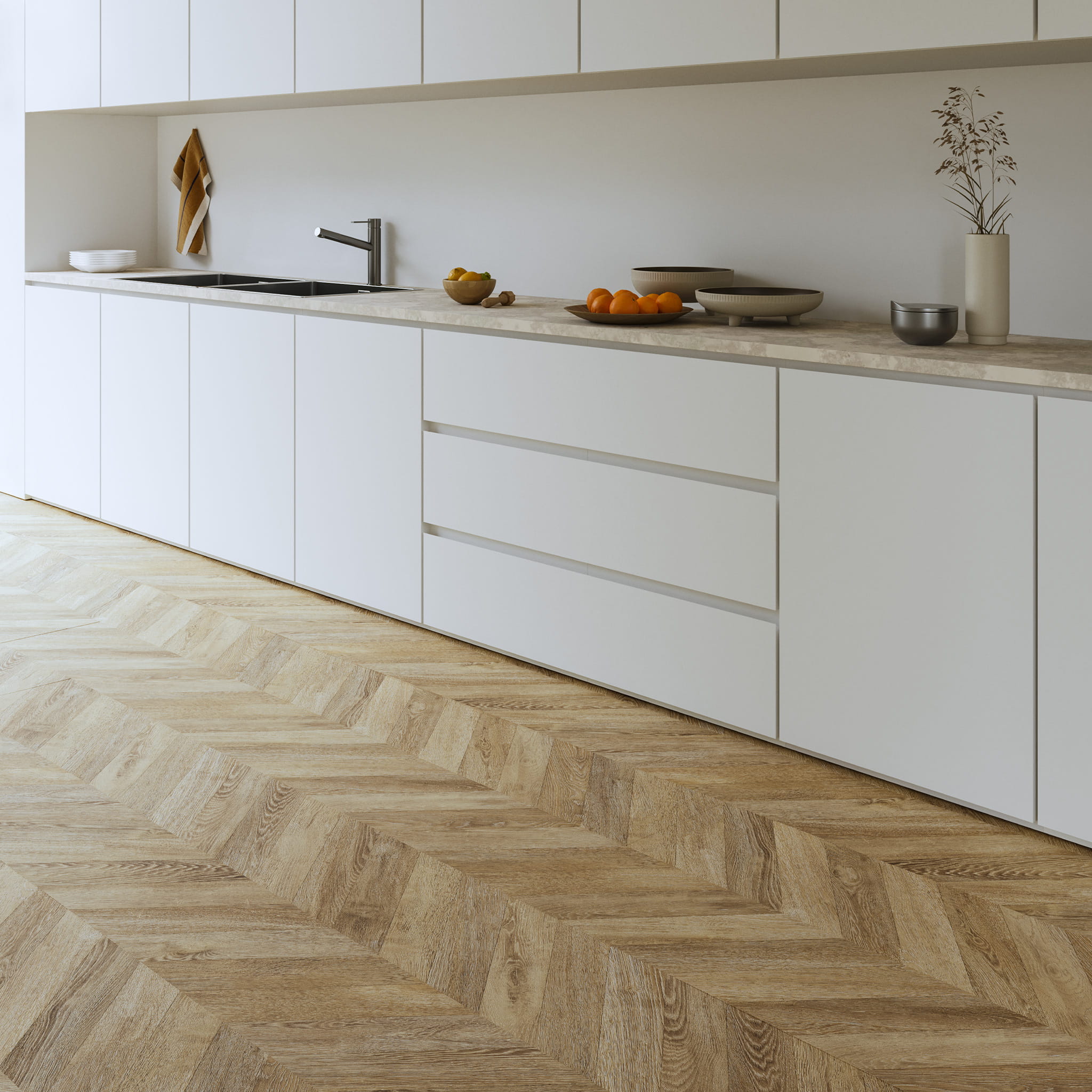 Piękno nieskończonej jodełki bez cięć i z ciepłym odcieniem świeżo lakierowanego drewna. Tak prezentuje się podłoga laminowana Espiga Boho z kolekcji Masterpices. Dzięki hiperrealistycznemu, ultra-matowemu wykończeniu, które podkreśla jego styl i elegancję.